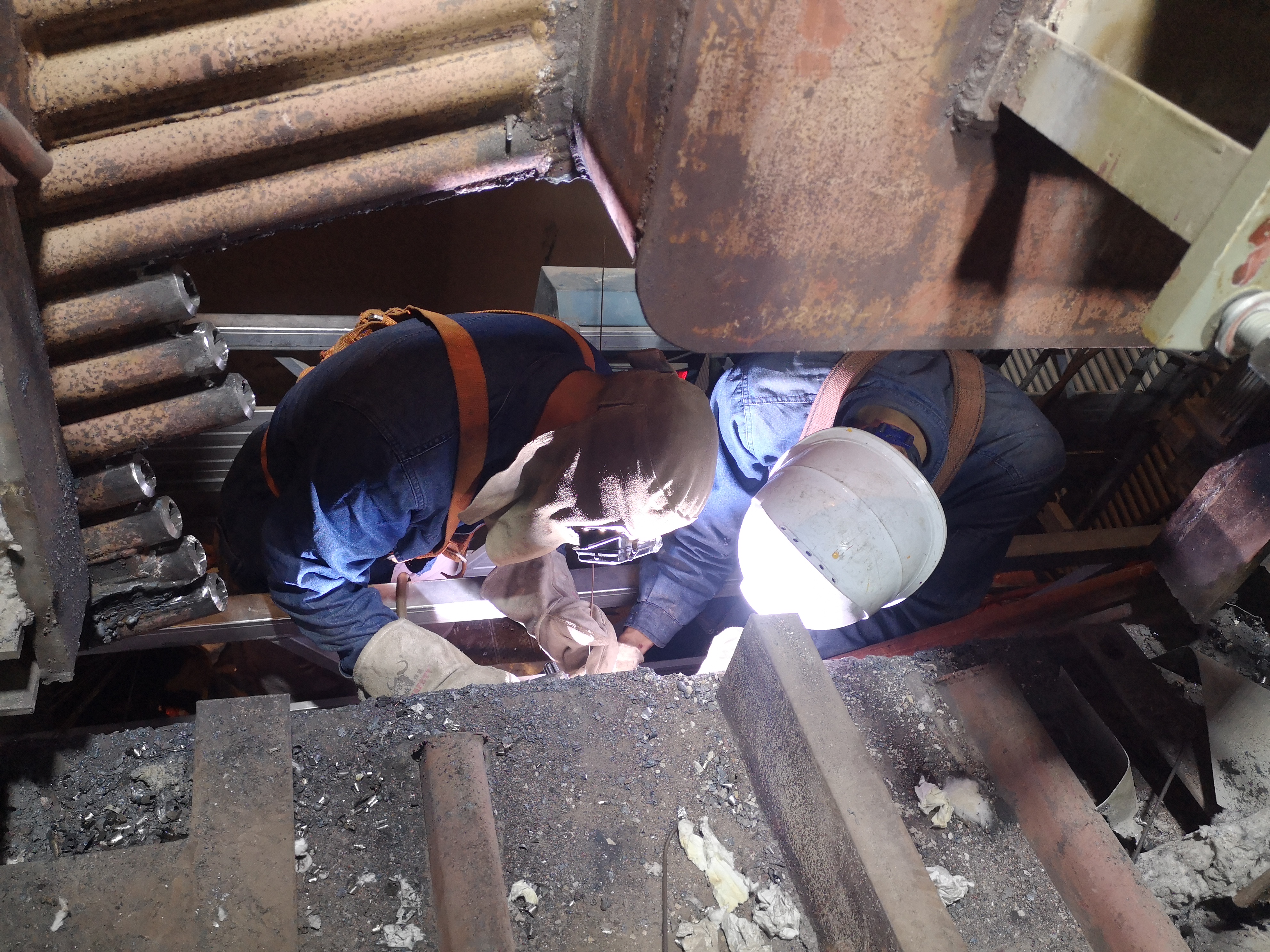 各項(xiàng)安全措施落實(shí)到位后,搶修人員隨即進(jìn)入爐膛,采用兩班倒、各專業(yè)多路分兵作戰(zhàn)的方式展開工作。密閉的爐膛內(nèi),迎著鋪面而來的粉塵,鍋爐班人員一絲不茍查找漏點(diǎn)、測厚、確定更換水冷壁的位置及長度;冒著高溫,各專業(yè)人員相互配合,割除、制口、下料各項(xiàng)工作有條不紊地進(jìn)行著。