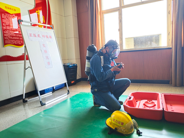 比賽開始,各代表隊(duì)展開激烈角逐。選手踴躍作答,評委犀利點(diǎn)評。搶答環(huán)節(jié)跌宕起伏、扣人心弦,將現(xiàn)場氣氛推向了高潮。正壓式空氣呼吸器實(shí)操比賽,渭河項(xiàng)目部戚華康一氣呵成,25秒完成正壓式空氣呼吸器佩戴全過程,贏得了全場熱烈的掌聲。