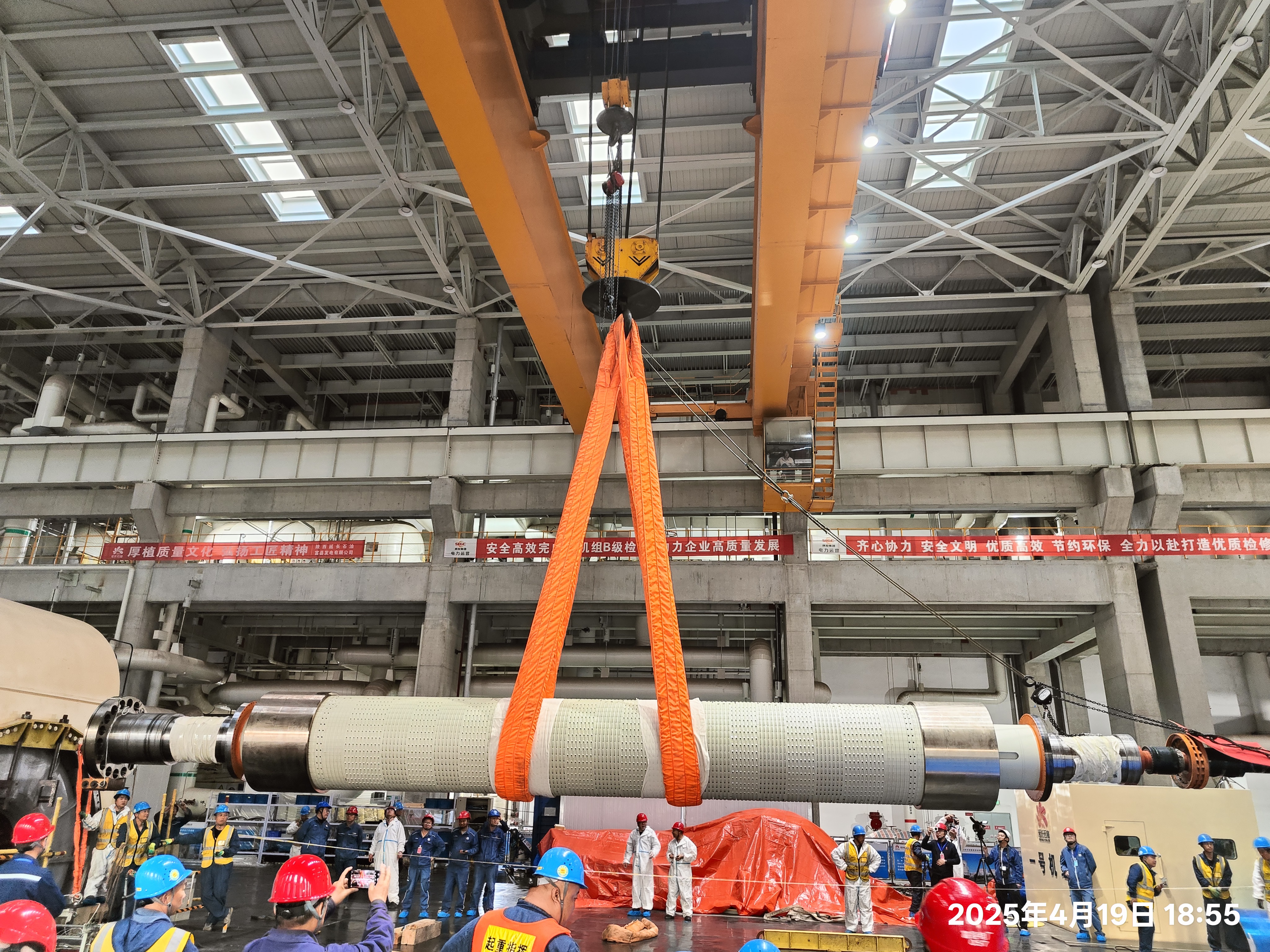 9時(shí)整,隨著總指揮一聲令下,#1機(jī)發(fā)電機(jī)抽轉(zhuǎn)子作業(yè)正式啟動(dòng)。汽機(jī)專業(yè)精準(zhǔn)翻出#9、#10瓦下軸瓦,規(guī)范安裝定制滑板及定位滑塊。電氣團(tuán)隊(duì)使用專用工具無(wú)損拆除定子氣隙擋板,兩臺(tái)行車(chē)在起重工程師的無(wú)線電精準(zhǔn)指揮下,通過(guò)智能聯(lián)動(dòng)控制系統(tǒng),以0.5m/min的勻速協(xié)同作業(yè),整個(gè)作業(yè)過(guò)程展現(xiàn)出“毫米級(jí)精度、微米級(jí)控制”的專業(yè)水準(zhǔn)。