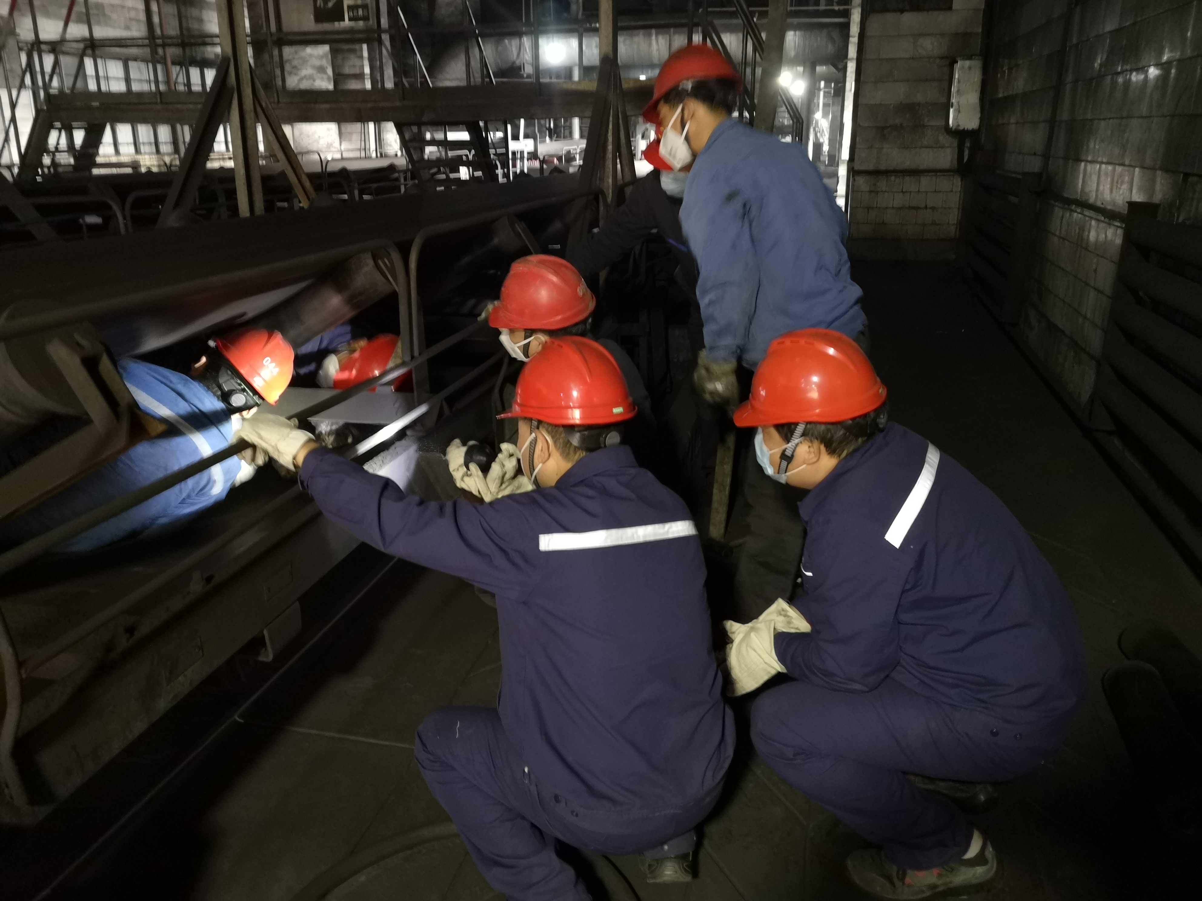 搶修現(xiàn)場(chǎng),狹窄的空間內(nèi),突擊隊(duì)員弓著身子,用背使勁頂起沉重的皮帶,使損壞托輥處于無(wú)壓力狀態(tài),再小心地用榔頭一下一下敲擊槽口將其拆下,然后將新托輥放入槽口。工作中,時(shí)常遇到托輥卡死的情況,就需要焊工使用火焊將卡死的托輥割下來(lái),而這一切都需要突擊隊(duì)員在皮帶下,或躺、或蜷,以各種“奇特”的姿勢(shì)進(jìn)行,工作的難度可想而知。
